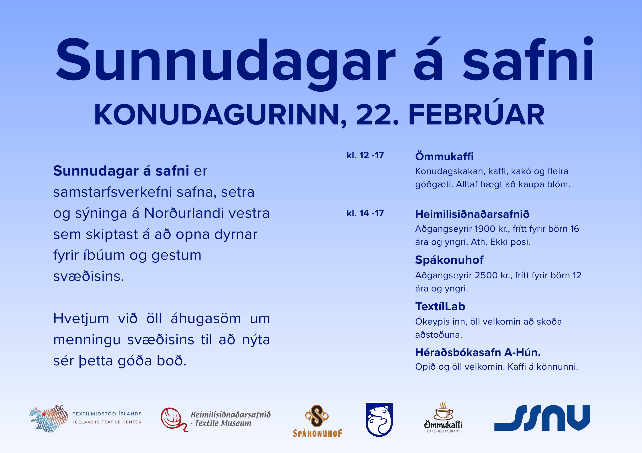Eitt af þeim spennandi verkefnum sem SSNV hefur unnið að undanfarið er Samstarf safna, sem miðar að því að efla tengsl og samvinnu safna, setra og sýninga um allt Norðurland vestra. Fulltrúar þessara menningarstaða hafa hist nokkuð reglulega og úr samtalinu spratt skemmtileg hugmynd: að sameinast um sérstakar sunnudagsopnanir yfir vetrartímann, þegar flest safnanna eru annars lokuð.