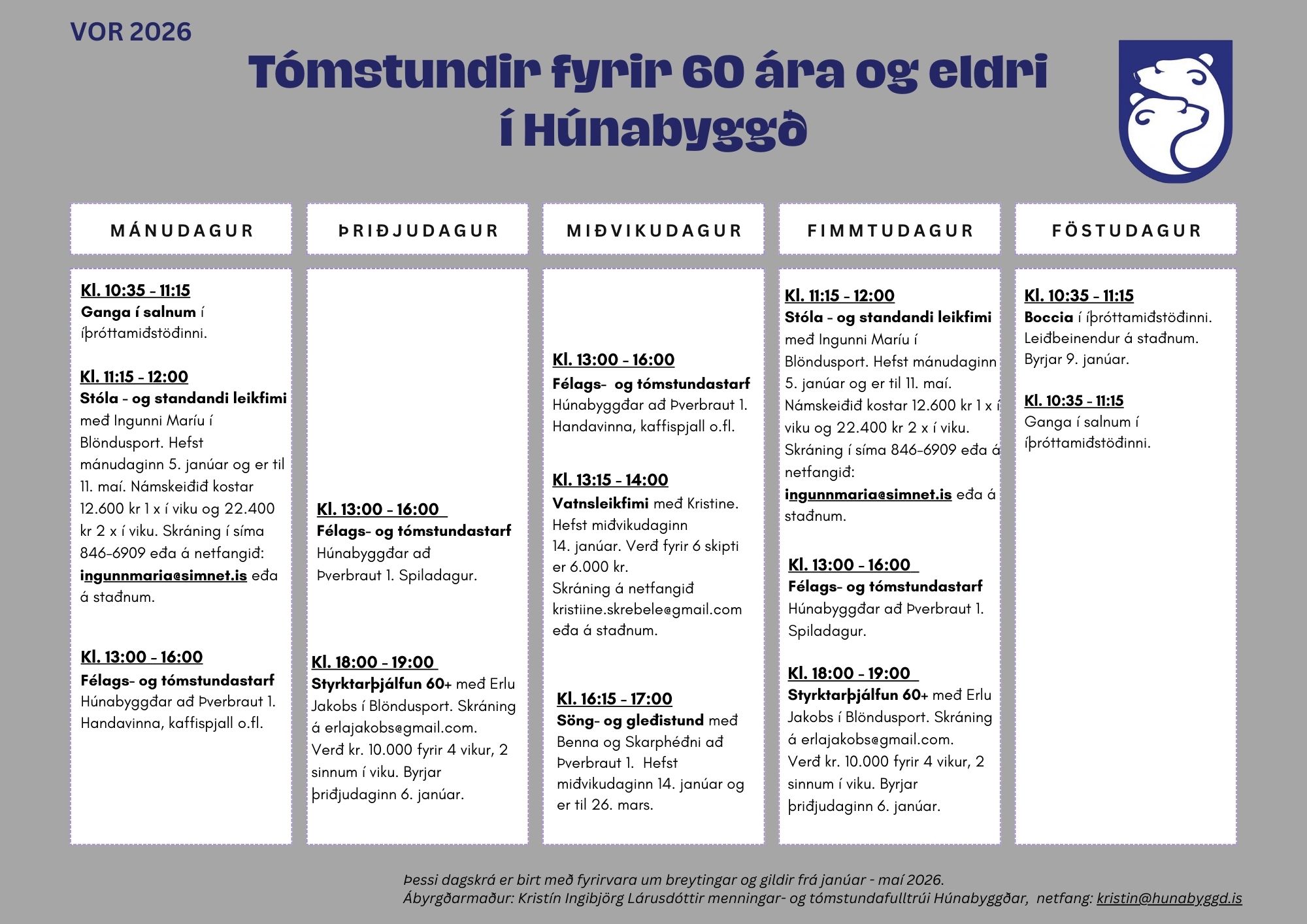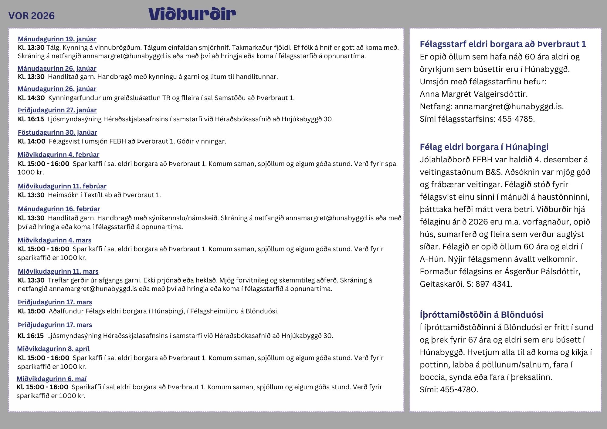 Tómstundadagskrá fyrir 60 ára og eldri og öryrkja í Húnabyggð er fjölbreytt og ættu flestir að geta fundið eitthvað við sitt hæfi.